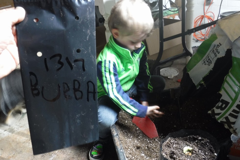I have to share this with you all.Jackson asked me how to spell Bubba.He said I can make a B.What are the other letters??I said a U and a A. He said whats a U? So I wrote Bubba on a cardboard box.This boy constantly amazes me.I wrote the 1317 He wrote BuBBa.We took the kins out of there little peat pots first day up.I put them in 1 gallon bags.Will do some more tomorrow.Will hope to plant outside before May 1st.Thats early here.