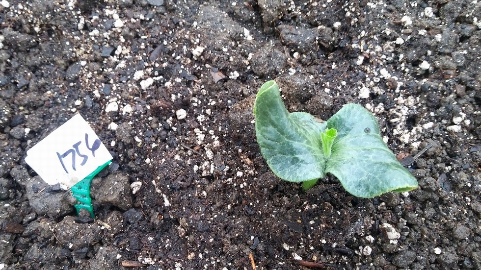 The 1756 is only 2 days above ground, but it already has a true leaf, so out in the patch it went.