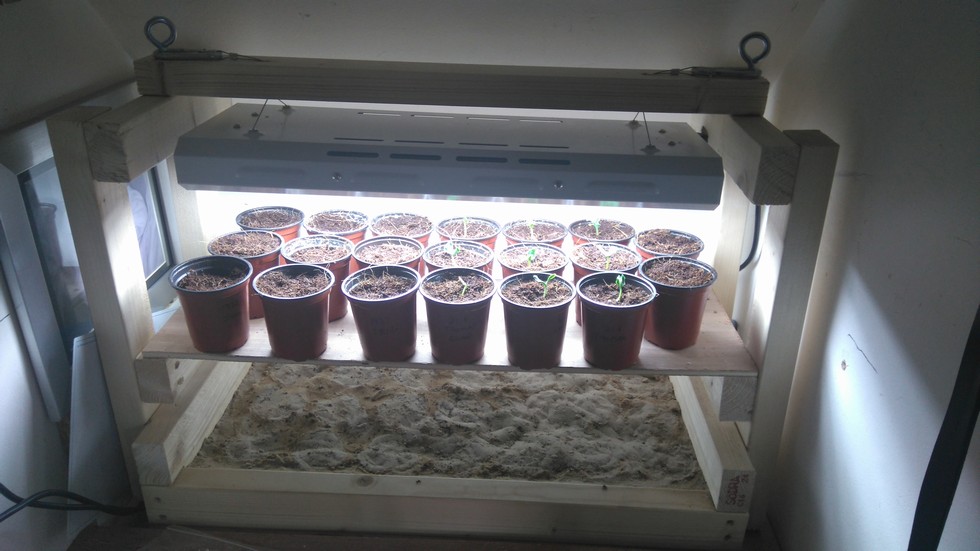 The work tunnel is where my Giant Tomatoes and Cucumbers will be going, about 5-6 plants. I really enjoyed putting together this little seed started station. At the bottom is a sand bed with heating cables in and once seedlings are up I can raise or lower both the shelves or the lights. Why didn't I build this before I staretd my pumpkin plants?... there's always next year!