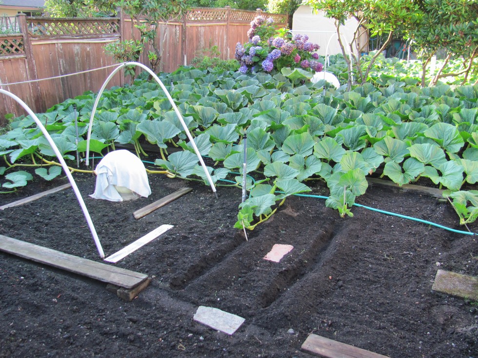 In this photo, you can see that I have curved the last 3 secondaries on one side to grow forward to fill in a large space, and then past the pumpkin on the main vine, is another 3 secondaries that will fill in the space on the other side of the pumpkin. I will leave myself a path to get to the pumpkin, other than that, ths soil will be covered in leaves.