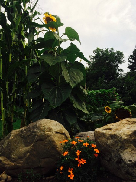 Here's the "short" big head sunflower ... They were supposed to be 2-3' tall with big heads...now almost 8'... He prolly wanted to see if the corn was ready to pick...