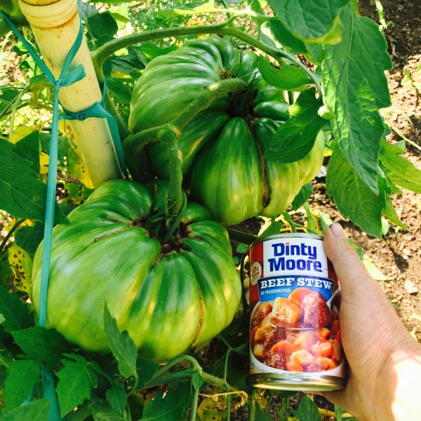 Wow... Exciting day today...here's a couple domingo's growing on the Same truss...there's a third on the plant that has caught up to these...I really need to gain some discipline in the pruning/only one tomato department...next year...yea...next year...also, and maybe more important ...the dinty moore?....