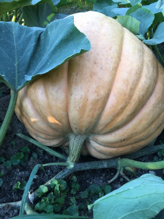 Late start this year. 3rd year growing AGs. Took a couple years off when I moved. First year (2011) grew several 70-90 lb pumpkins with almost no care to the plants. 2012 got serious, got some champion seed from P and P Seed, and with some advice from Don Langevin's Books, began a serious growing program. All pollinations that year failed. 2013 we were trying to sell our house, so I put the pumpkin patch in grass. 2014 and 2015 we were in transition to our new home, so no growing. Almost missed out on 2016 till I heard my folks talking about a friendly growing competition. Started 5 seeds outdoors this year on June 7 in a fine patch of newly turned over old pasture ground. The first sprout emerged 6 days later and started growing explosively. The first fruit was pollinated a bit over 10 foot out, and here she is growing at 41 days after pollination. This beauty is growing from seed from my 90lb AG grown in 2011. OTT estimates put it at 111# on September 1. Definitely not a world record pumpkin, but none the less a personal best. Maybe enough to take our "local" contest.