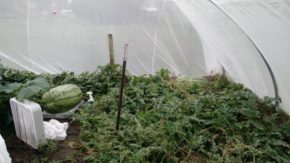 Plants are starting to show there age, and I found a state record robbing watermelon hidden in the corner, he tapes 103#, the other one on the plant is 180#, this sucks wonder how many inches it robbed? Big one is on the main, the corner one was on a side vine