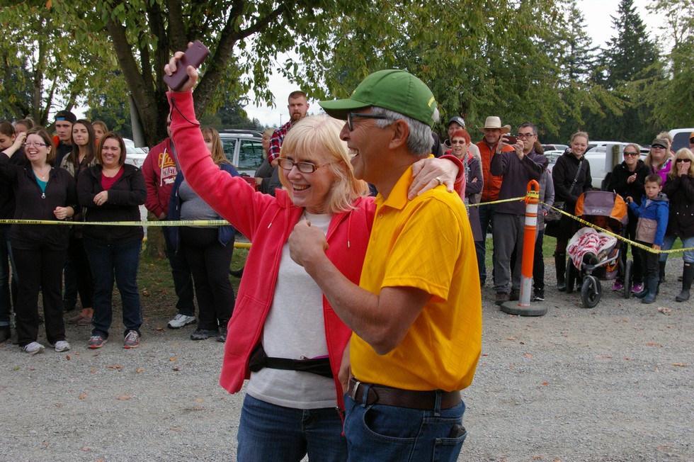 Janet beside her husbaand Richmond Dave, celebrating her 10% heavy pumpkin that gave her the first pumpkin over 1000 lbs.