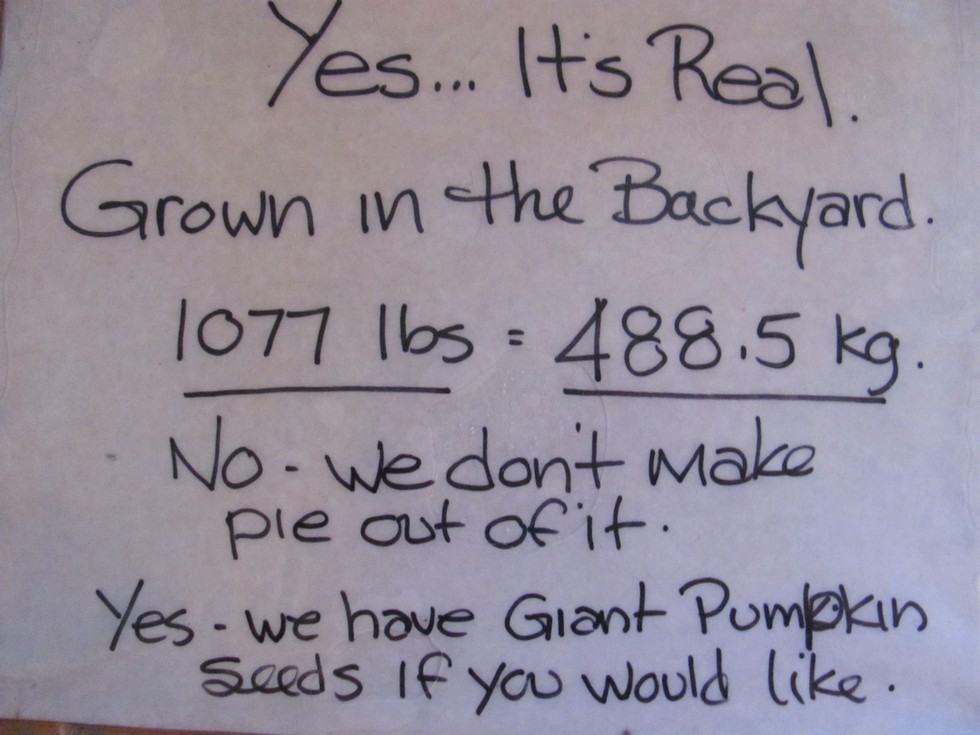While the pumpkin was on display, we had this sign, and a bag full of seeds at the front door. We gave away hundreds of seeds this year...
