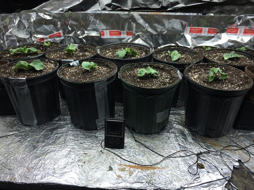 Here they are back under the T 5 lights, with lights 16 inches away, fan running and still a nice 82 degrees under the lights.