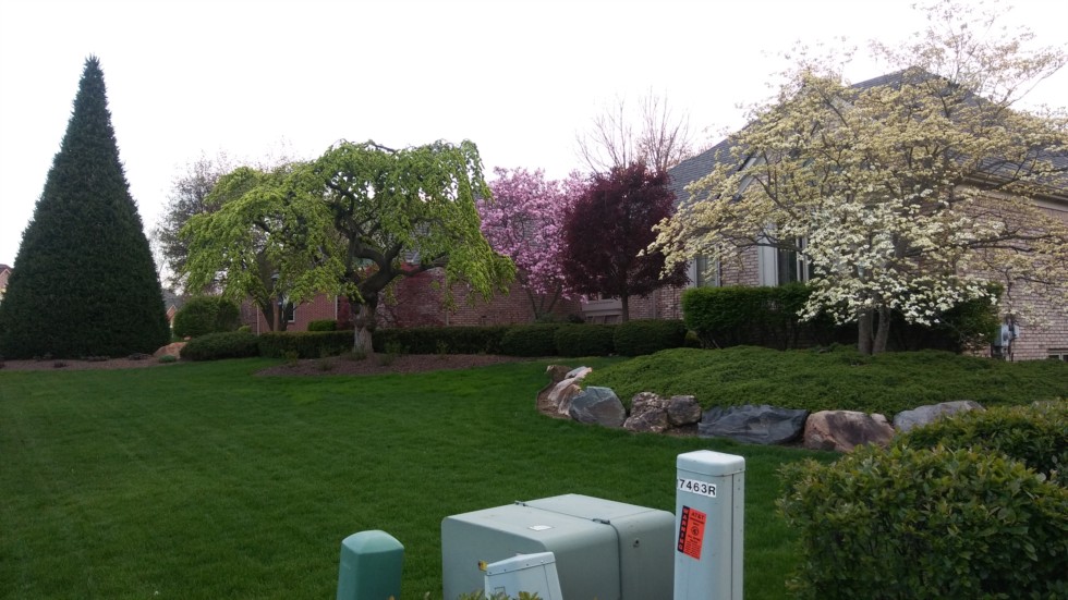 Spring time in michigan. The chrismas tree is a 20 foot norway spruce the weeping bonsia tree is a camper down elm behind that is a magnolia tree the deep purple tree is a dwarf crimson king maple and the large white tree is a dogwood tree.