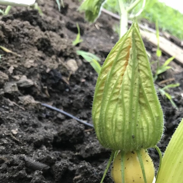2nd pumpkin on 1223.5 This was not expected. Completely turned bright orange on the tip this afternoon. It was green this morning. I was thinking Friday or Saturday but tomorrow I think. Maybe it knew I was going away on Saturday. Also maybe it knew that it was going to be 90 degrees Friday and Saturday. It wants to get pollination in and settled before the heat. Still can abort but better to pollinate in 70s not 90s