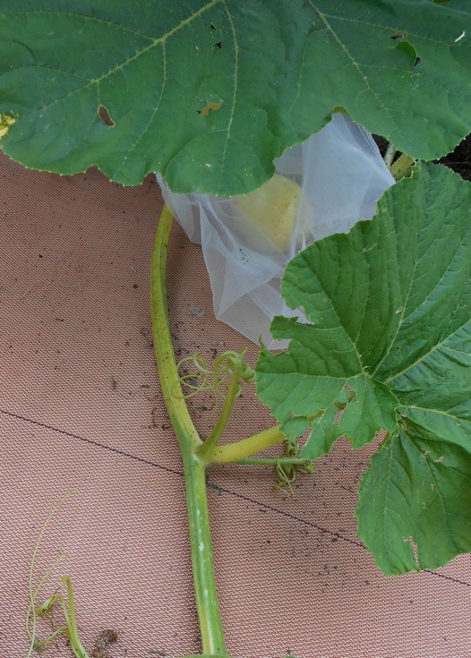 The pumpkin in the picture (my 2145 McMullen ’15) is inside of a 5-gallon paint strainer bag which I use on all of my pumpkins to protect them from any potential bird, chipmunk, squirrel, or “other varmint” damage. I like these bags because they breathe so the pumpkins do not get to hot and also allow me to visually inspect the pumpkins and move them as they grow. The material is similar to insect netting so it also keeps bugs off the small maturing pumpkins. I put these on the day after (or so) I spray them with Anthesis.