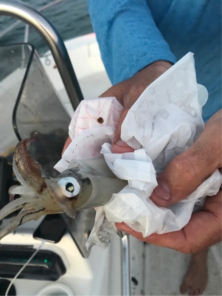 This was a squid that my dad caught. This one was very cool. Pooped the ink out everywhere on the boat. Tossed this squid in the freezer overnight and Used it for bait today.