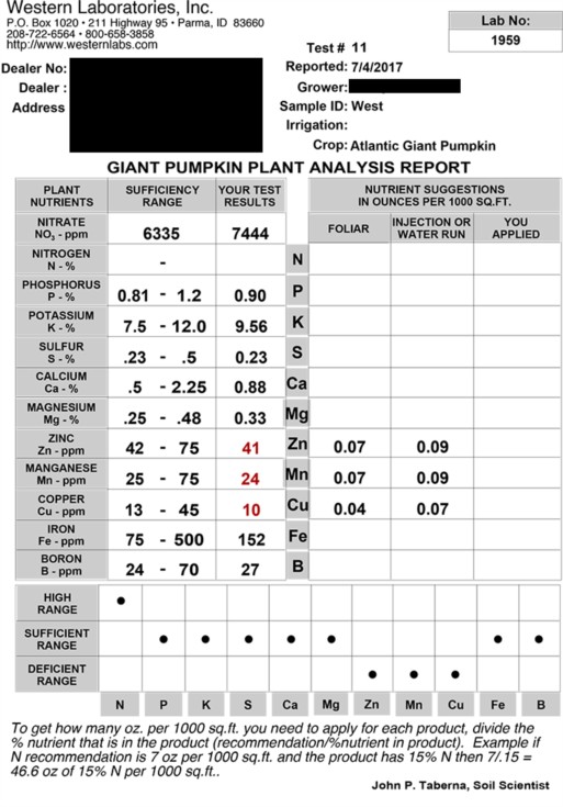 an email from Ron W Very nice results!! Start with as a drench 4 ounces per plant Epson salts for Magnesium and sulfur. Yesterday I drenched 6 plants so I added 24 ounces epson salts to 300 gallons of water and watered plants. To this I added 2 ounces zinc sulfate, 1 ounce manganese sulfate and 1/2 ounce copper sulfate. You could do the same thing.... WHat I also do is I have switched my contact fungicide to Manzate as it contains zinc and manganese. That way once a week when I am spraying for foliar disease I am also getting results for manganese and zinc as well. I would also add 1/4 ounce per 100 gallons of water Borax for more boron. DO you have a tank you can mix in and water from? Ron