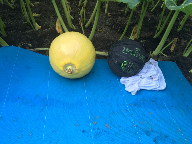 Dap 14 today for this pumpkin. I used a basketball for comparison and as you can see it's bigger then the ball. Just put that mill fabric on yesterday. The key this year was to pollinate earlier. That is what needed to happen and it did.