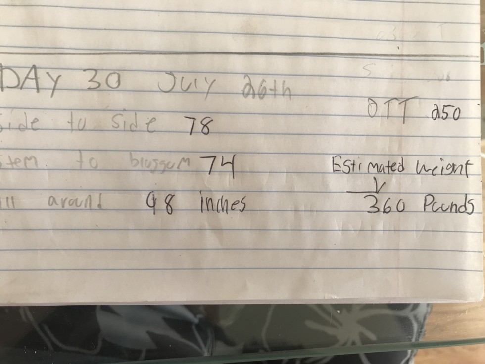 Day 30 numbers! SIDE TO SIDE 78 INCHES STEM TO BLOSSOM 74 INCHES. All AROUND 98 INCHES