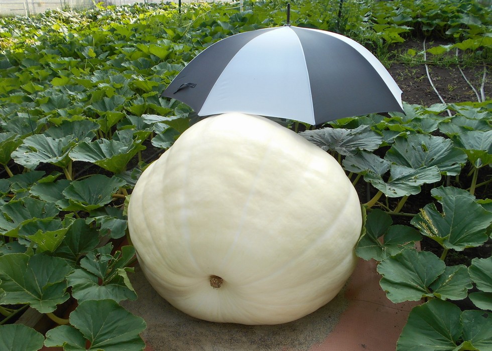 Looks like I have a white pumpkin on this plant and it also has a high shape. I left the umbrellas at the same height that was in my previous pictures for a source of comparison. Overall, this plant still has some room to fill-in but the secondary growth has slowed down probably due to the growing pumpkin. Growing these giant pumpkins timing is very important. The change of vegetative growth to fruit growth is an important transition that needs to be orchestrated carefully. The challenge is that the each year the weather is different and timing the pollination time with the size of the plant is where the grower can in part control this shift.