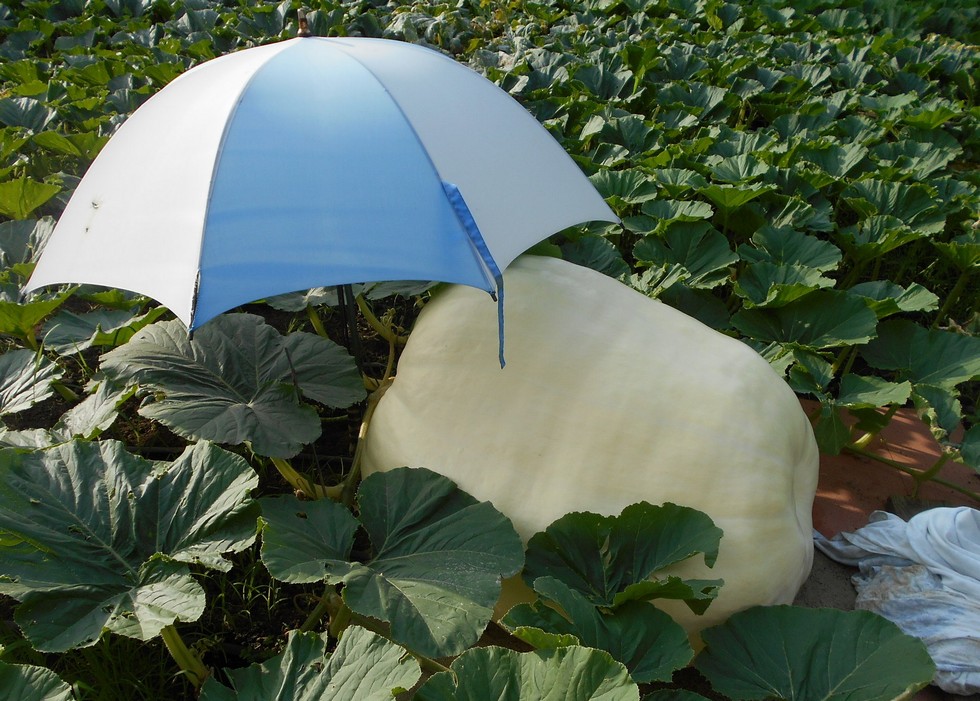 This pumpkin has a shape similar to the parent, and I am also hoping the high percent heavy trait also carries over. One odd characteristic that I have noticed is this plant did not like the recent heat wave as the leaves that were developing at this time simply burned, and then when cooler tempers return the burning stopped. I have heard that this plant was very heat tolerant even in the Kentucky summer, so I guess I chose my seedling poorly;-) but I still have plenty of good (well ventilated) leaves to hopefully push this pumpkin the rest of the season.