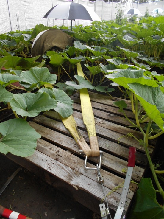 All six pumpkins are growing but this one needed a little adjustment since the stem in on the short side and not providing the vine a lot of room between the pumpkin. Pulling it back a few inches should provide room for it to grow and not break itself off the vine. All pumpkins are growing but the rates have slowed way down, I think in part due to the cooler than normal weather.