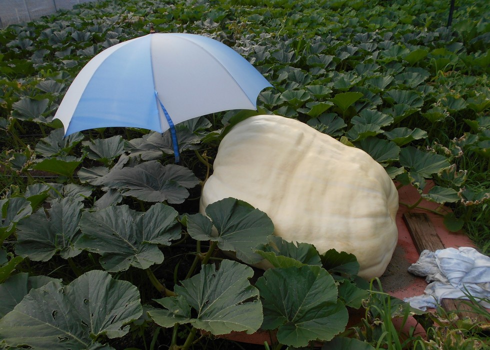 While this pumpkin is maintaining its long shape it is starting to get some ribs to it that are causing it to lose its once nice symmetrical shape. Also, the plant continues not to have any burn to the new growth, but some of the older leaves that were at a certain stage of development in the heat are looking worse. This is an odd occurrence, but there is always something every year.