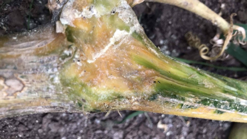 Here is the infection on my 1223.5 gansert plant. It was dried up 2 days ago with sulfur and now it is back to sapping. This is 3 feet before the pumpkin on the main vine. Is this surface rot? It's getting more brown. It smells like rot. My email is henryswenson@gmail.com