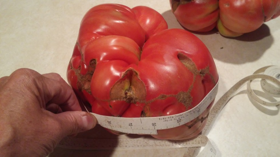 Here was the measurement of the 5.83 from the only angle that i could really see while it was growing. It had a short stem and i really couldn't see the other side of the tomato untill i picked it.