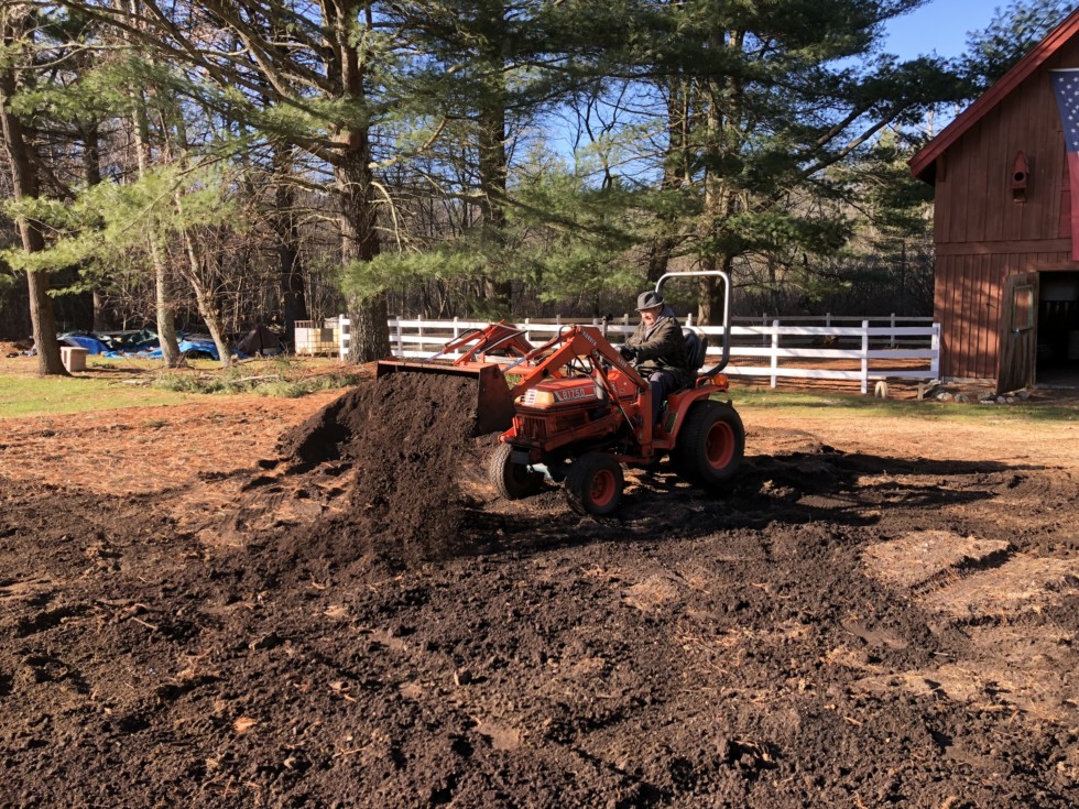Pap spreading the chicken compost. This compost is so light it could easily be spread with a wheelbarrow, shovel, and rake. No tractor needed, but does help make for quick work!