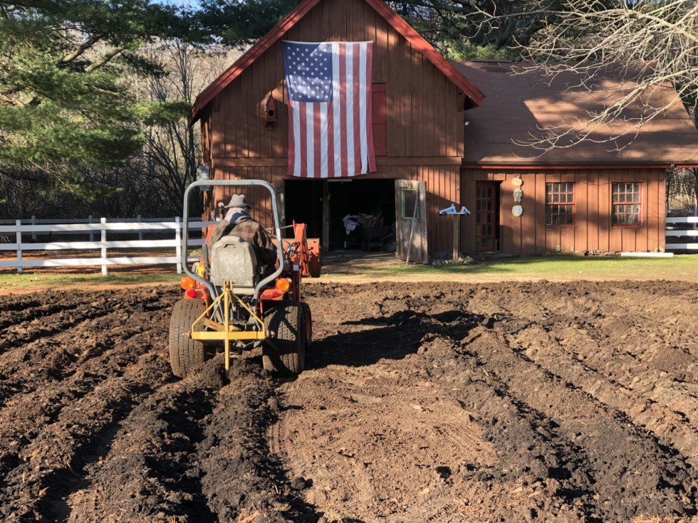 Before tilling we hooked up our single shank subsoiler, but added the middle buster blade to it. The middle buster is very versatile, and is used for laying rows, opening furrows, digging potatoes, digging trenches for water lines, or just general field preparation. We chose to use it as I wanted to bring up the soil from below so it mixes completely when tilled with the leaf, and chicken compost.