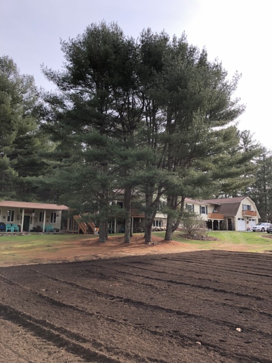 Next on the list to prepare the patch was to remove some trees. This set of White Pines would be blocking early am sun if left.
