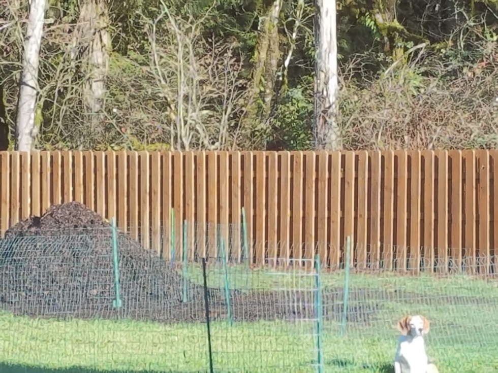 Max the Beagle gaurding his freshly turned compost pile.