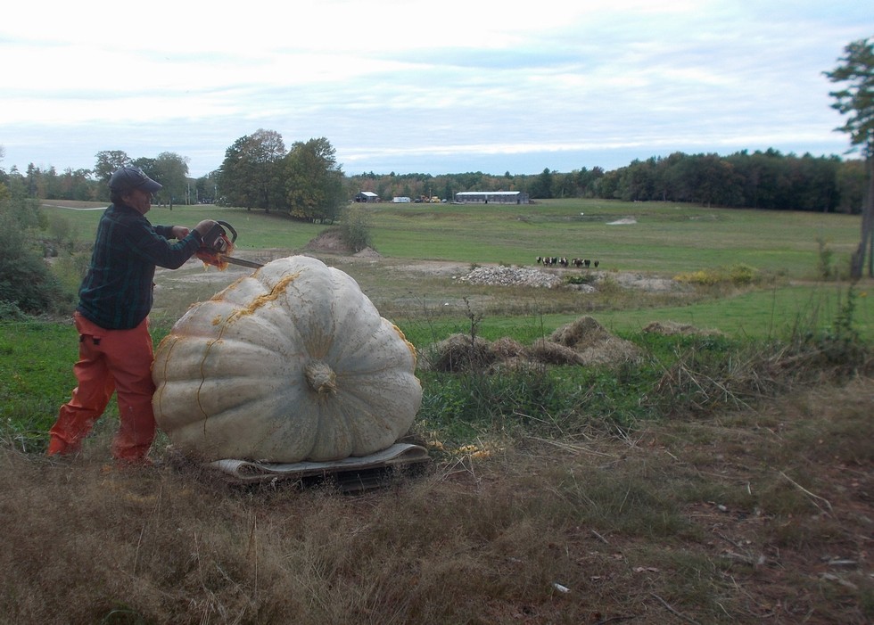 After the weigh-off I was offered to harvest the seeds and dispose of the flesh at Al’s place. This was certainly a unique seed harvest and I am very thankful for his help and generosity. He has some great pumpkin related helping tools. He pulled his skid steer right up to the trailer to unload the pumpkin, and then had a chainsaw and bibs at the ready.