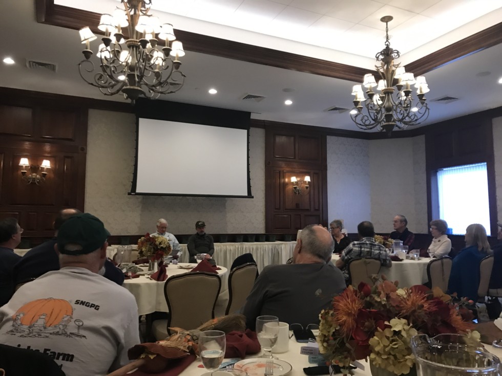 Enjoying the NHGPGA meeting. Woody Lancaster next to Steve Sperry talking about pumpkins