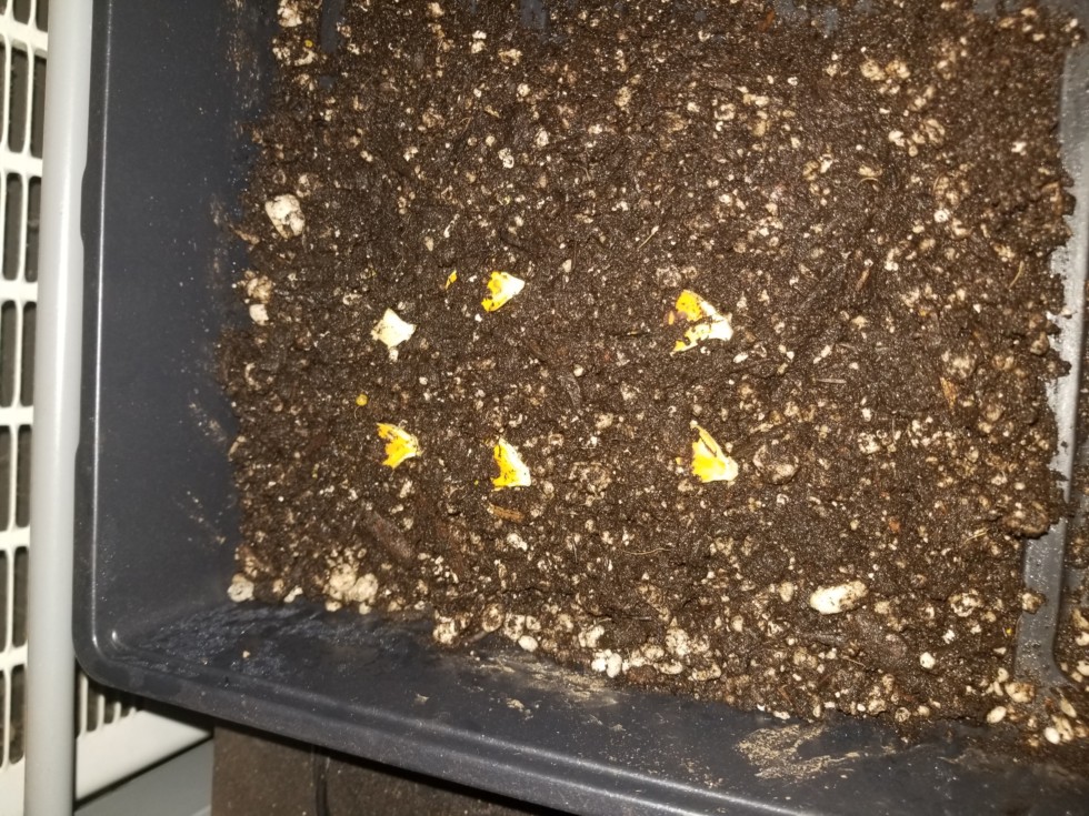 Here is what I did to get such a fast germination. Here we have my 6 seeds. They are just resting below the surface of soil that has been heated to a constant 87° F. (Don't worry the genetics of the seeds has been written on the seed coat in Sharpie).