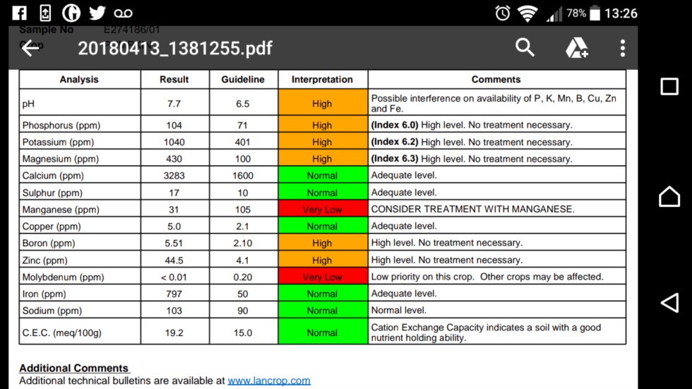 Got my soil test result today. Pretty much exactly the same as last year. Annoyingly the pH has stayed the same despite treating with sulphur chips. May have to change tack on that one. In terms of interpretation, nothings changed but levels for everything apart from iron are lower. Whether this is due to winter rains or lost to last years plant I don't know. Really will have to do something about the manganese this year though.