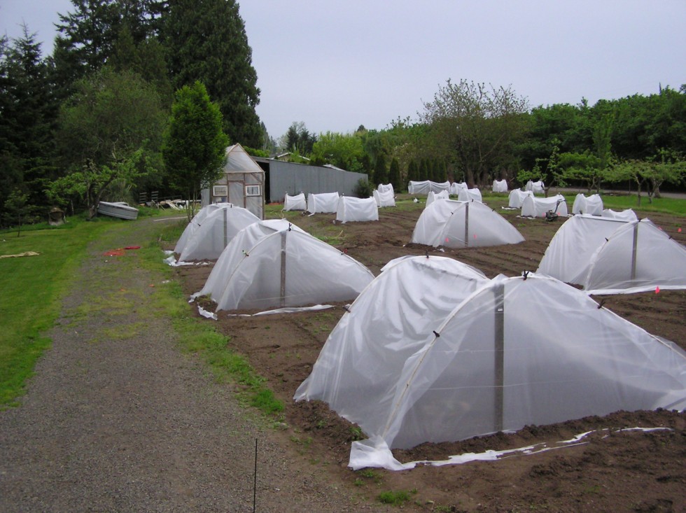 Here is a great pic of some of the different shapes, sizes and qualities, of cloches I have used in the past. This one pic kind of shows them all. I have since standardized things down a bit, but in a pinch, this is all it takes to keep those baby pumpkins warm enough to grow through the early spring. I will be posting pics of my newest versions later in the spring when I get them put up.