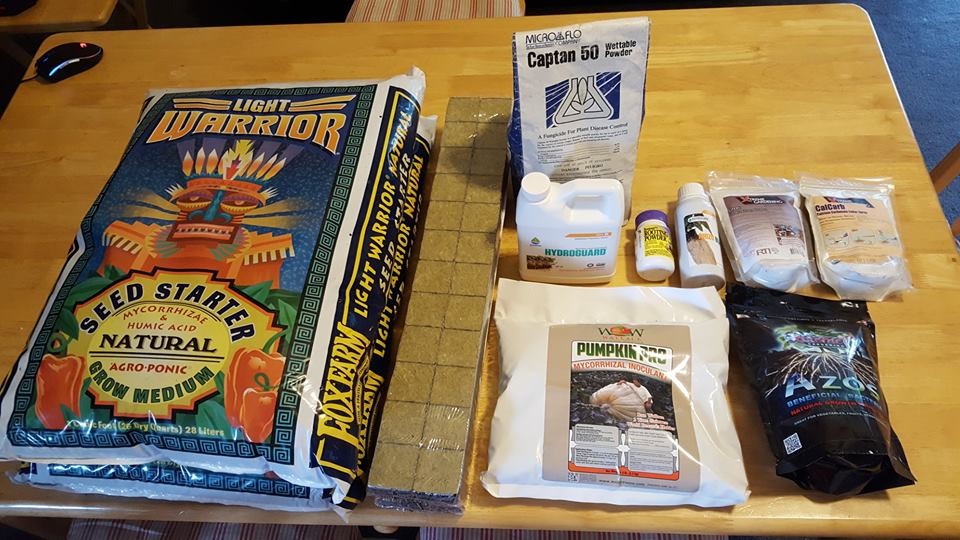 Okay, here is the goodies I use for starting the competition Giant Pumpkin seeds. I am going with a base of Light Warrior seed starting mix instead of a sterilized mix. Got my Pumpkin Pro Inoculant along with my Azos to boost populations of beneficials, Hydroguard for root defense, Rhizoboost and powder rooting hormone for out of control root stimulation, my calcarb for a quick spritz when the seedling emerges, and Captan to lightly powder the seeds after they soak in water and before they go into the starting mix. Remember, in giant pumpkin growing, overkill means you are just getting warmed up...