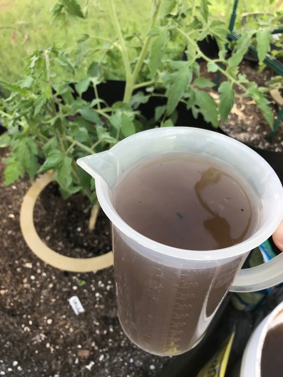 This is what Terp Tea Grow looks like after a 24 hour bubble tea setup aerated it in a 5 gallon bucket. I gave a little more than a liter to each plant.