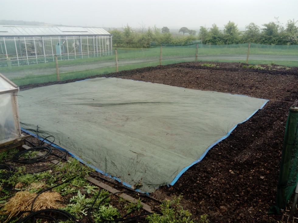 Weather over the weekend has been unfavourable. Back to heavy rain and cold. Missed the opportunity to get soil cables and cloches in so tarps went out to try and keep the ground dry. Will be end end of the week before I can get back on it again. At least it'll wash the sulphur chips in!