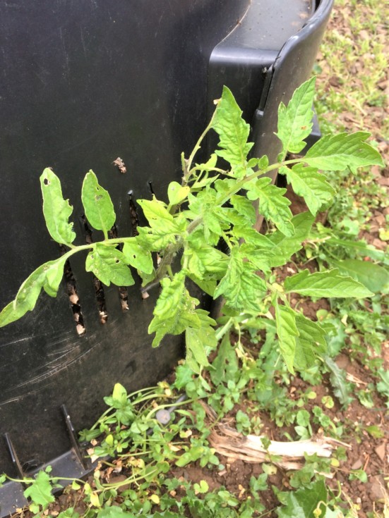 I guess I missed a seed last year. Now its growing out of my little compost bin. If I can accidentally germinate one anybody can! There are more on the other side. I will try to save one of them and grow it as a mystery plant. I will use the two year compost today and tomorrow to put into each tomato planting hole.