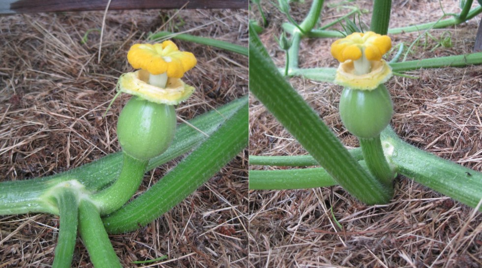 Is this my dear Elphaba? This morning I havenŽt been at home, therefore this was an open pollination. However, sheŽs a beauty and in a perfect position (main vine somewhere at 13 ft). It would be my earliest pollination ever, but the plant is doing fine, it has at least 16 secondaries between stump and fruit which may be retained while the fruit grows, and I know that every day counts (in 2014 we#ve had an early start of fall in the middle of August), and the next decent female will open in 4 or 5 days, I guess. So if this one takes, IŽll go with growing this open pollinated one for weight, and for genetics IŽll perhaps grow a selfed one on a secondary. Time will tell...