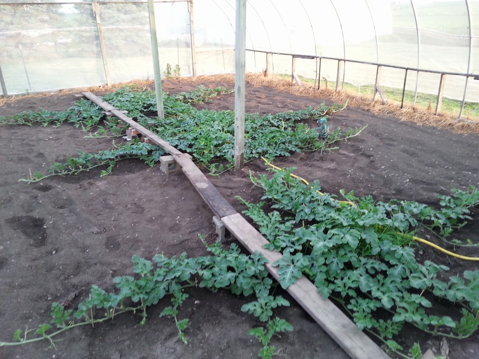 installed fertz feeder line to the 3 melon plants. On a timed/mg rate feeding meter and you can adjust the rate at the plants also. Plants are growing well. Had a storm roll through and roll a few vines, found out just how darn good the plants are throwing roots at the nodes. each node has roots, Excellent and just what I was hoping for so we pinned all the vine down with bbq skewers sticks. Added more night crawlers to the patch also. Amazing at night how many are on the bread we feed them, and yes lots and lots of fresh worm poo!
