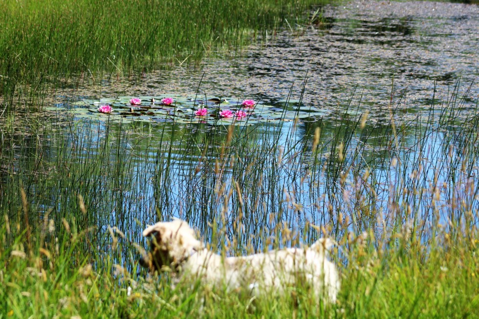 The little stinker is growing. Loves to chase the frogs at the pond. I planted those pink water lily's about 5 years ago as one leaf.