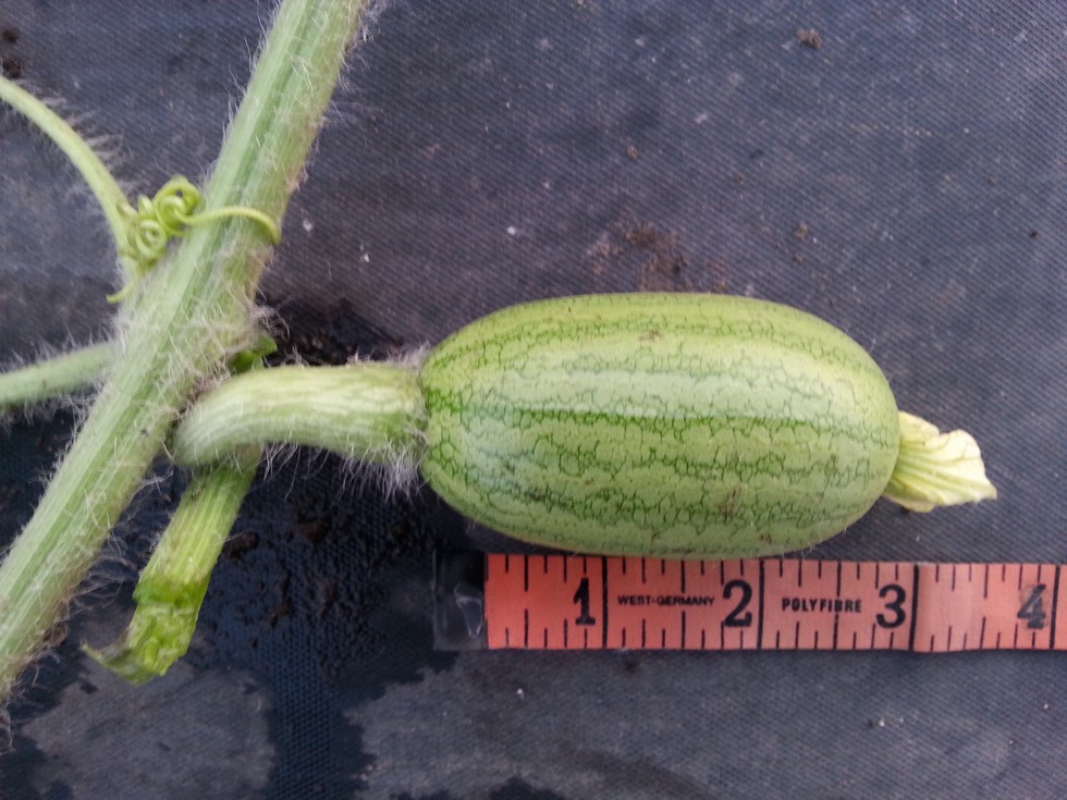 Pollinated this melon yesterday 6/26/18 so 1 dap. Body is 2 7/8" long x 1 1/2" wide. Stem at melon measures 3/4". I realize its way too early to get excited but....dang! This is the #2 plant that had Mr. Long Johns on. It is throwing out big females as well as # 3 plant. It is 13 ft out on a main, opposite end of former Mr. L J's position.