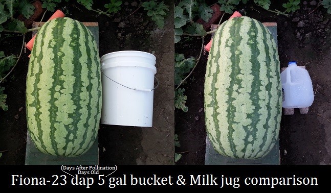 Fiona, 23 dap milk jug & 5 gal bucket comp. I've got pieces of boogie board foam under the bucket & jug to be the same level the melon is.