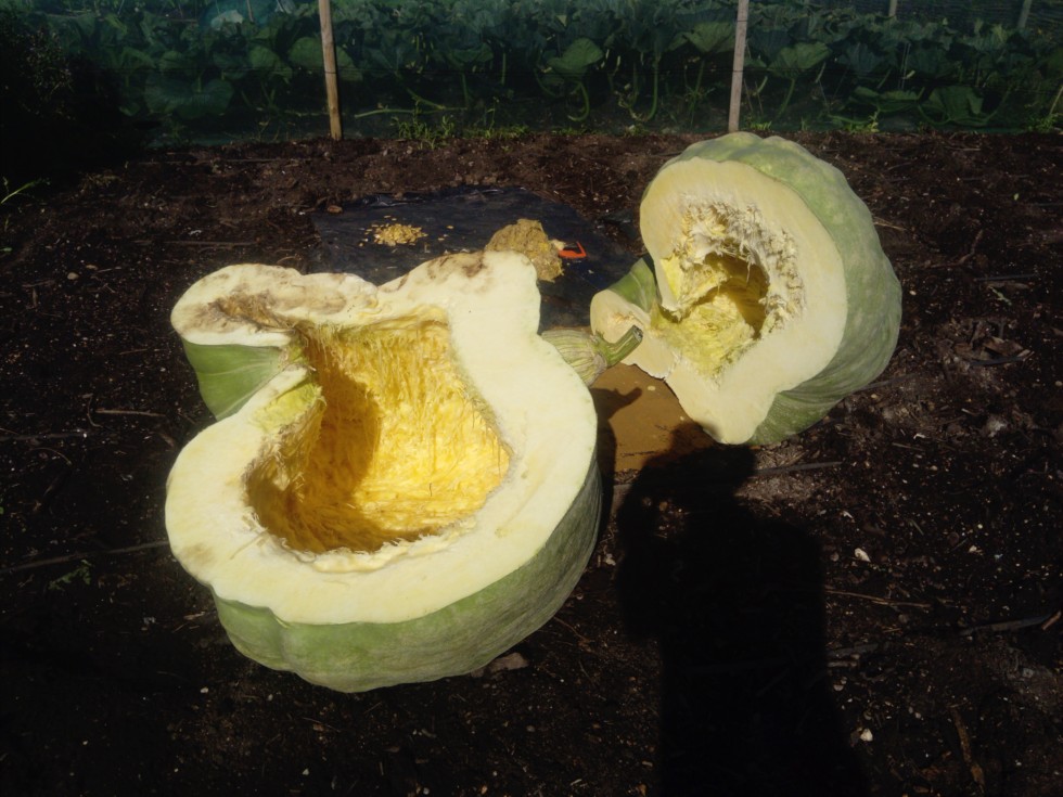Finally got round to clearing away my split 1807 squash. Bit unfortunate I feel as it's almost identical shape to my 1498 I grew last year that made it all the way. Final estimate was 546lb at 45 DAP. No means to weigh it so it'll go down as 546 Est Oliver UOW (1807 Holub x sibb) . Lots of good viable seed inside which is surprising but also good to see, as decent giant squash seed seems difficult to come by in this country. Every cloud and all that...