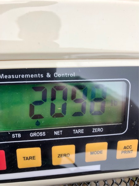 Woody Woody Woody. Ugh! What a beast you had going! Woodys pumpkin is down. A crack on the bottom formed. It was soupy in a corner. We got a weight on it. 2098 pounds! Good job! It was sure a beast. Next year is the year you get it to the scales.