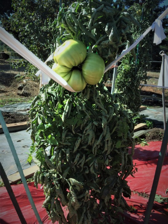 Another mid '20's tomato is from the 6.06 Spaziani. It is the only tomato plant that has two WOW season long starter paks. I only kept track of a few of tomato pollination dates and this was one of them. Today it is 51 dap. Still green with no sign of blushing.