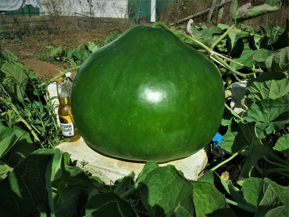 The other bushel gourd on the same plant. Love this thing! It has gained 4" ott per day the last 5 days. Pollinated the second week of August. These things are growing much larger than I anticipated so have to keep wrangling the vines to keep things from breaking. Never thought I would have to use my pumpkin lifting straps for a bushel gourd!