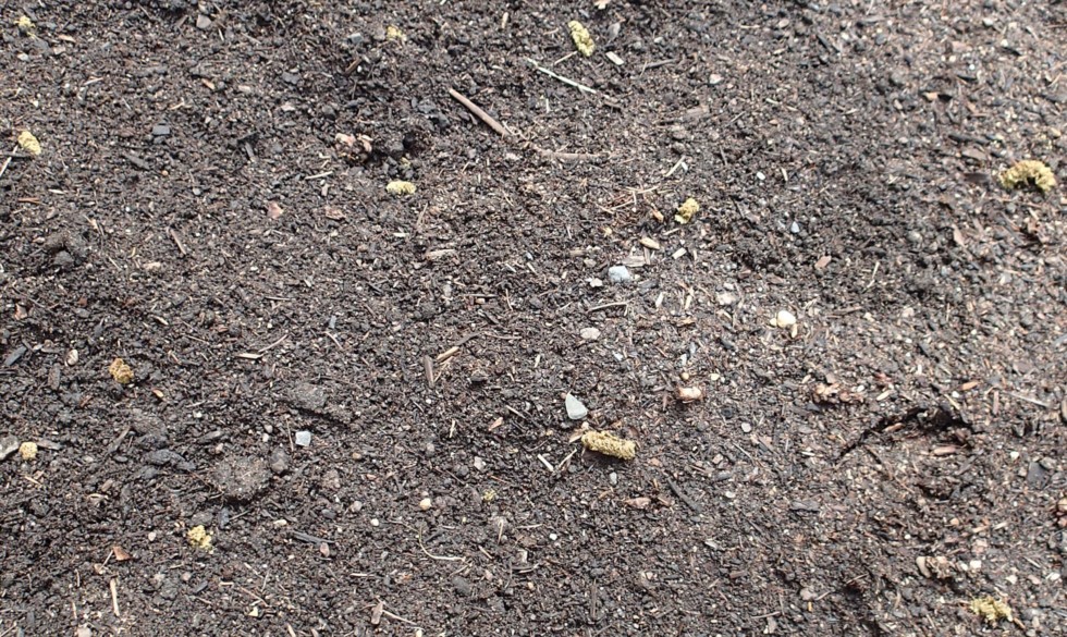 LOL! I thought a small animal used my pumpkin pit as a restroom, but nope, this is what happens to alfalfa pellets when they get wet. Next year I will get the alfalfa meal so it will mix in nicely and not look like bits o'cr** lol!