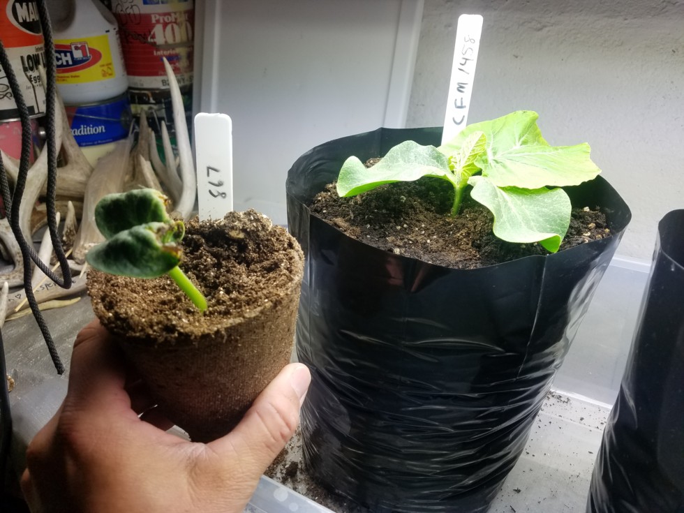 Call me crazy, doing a 5th plant outside greenhouse. Still mostly lawn yet. Left plant is 867 Davis, 1st attempt (healthy looking seed) didnt take, so I put in another that looked like it survived a mail roller, barley. But hey it popped! The other plant is the 1458 charity f'n Marshall (1989.5 Daletas x self)