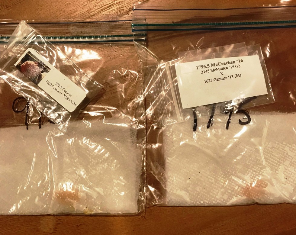 Neither the 1795 McCracken nor the 1495 Snyder seed sprouted. Dug them up – no action. I think I had the heating pad set too high the first day I put them in moist towels in plastic bags and baked them. Still had a final 1795 McCracken to restart and a nice orange 975 Gansert. This puts me a week behind and a potential pickle with my upcoming 10 day trip starting May 2.