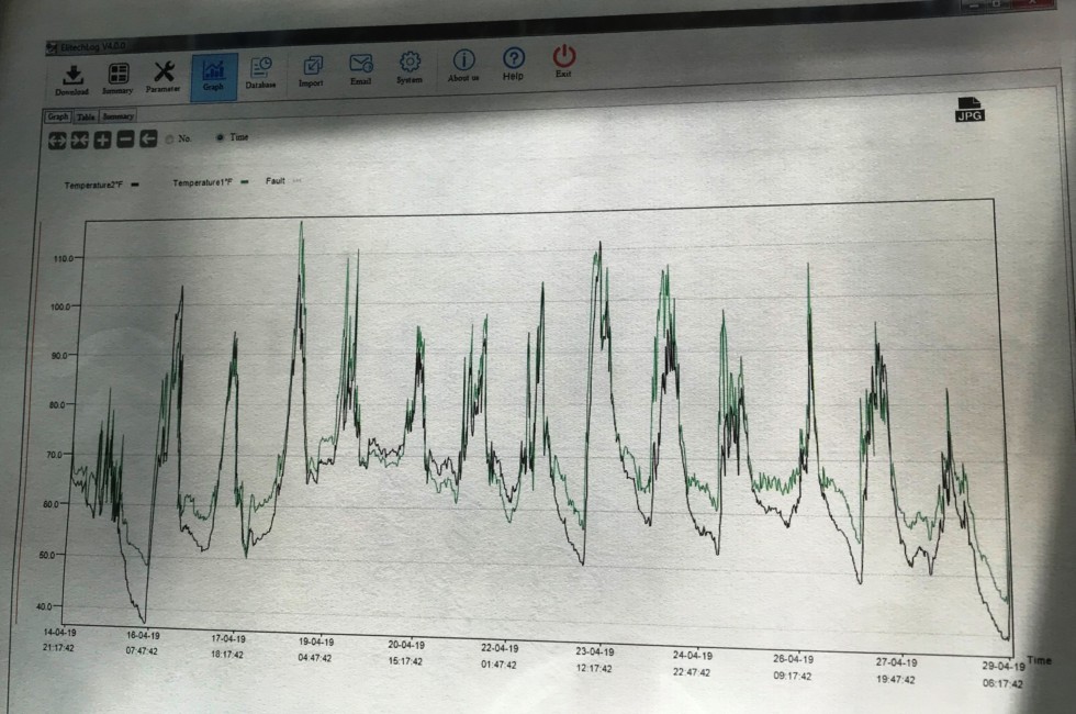 FROST last night! – temp outside exactly 32 deg at 0730 in shade (sun up). Checked Elitech record of last 10 days of greenhouse temps – green line at ground level middle, black at 4’ middle. Thermostat at 4’ against wall. 1200watt and 400 watt heaters on. All week interior night at set point of 60 deg until last 3 cold nights, 60 at ground, 50 at 4’. Heaters on ground and so blowing warm air at ground level (kins like that), Maybe ground heater cables added some warmth. Last night 46 and 40. Pumpkins and tomatoes look fine this morning. Whew! Supposed to warm up from now on.